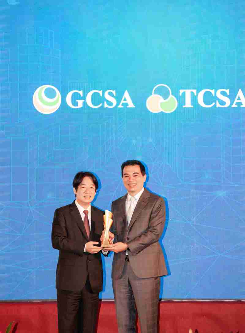 达全方位永续表现获全球永续奖及台湾永续奖肯定,,,由副总统赖清德颁奖 (左),,壹号平台总经理柯富仁 (右) 代表领奖